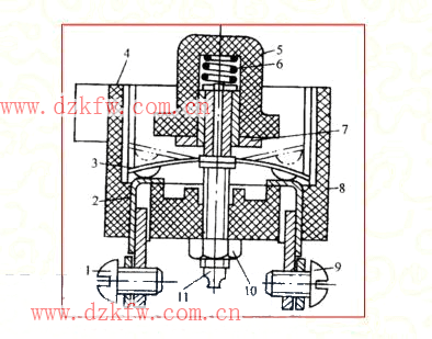 1、9-接線柱 2、8-觸點 3-雙金屬片 4-外殼 5-按鈕 6-彈簧 7-墊圈 10-鎖緊螺母 11-調整螺釘