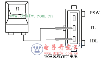 ②檢測全開觸點端子電阻。拔下傳感器接線插頭,用萬用表的電阻擋測量傳感器的全開觸點端子(PSW)與可動端子(TL)之間的電阻值,其電阻值應為o,如圖2-9所示。轉動節氣門軸約55°,電阻值應為0Ω。