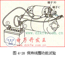 將起動機勵磁線圈的引線斷開,按圖4-27所示連接蓄電池與電磁開關。