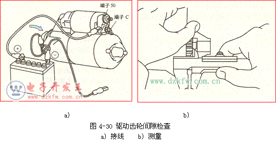 按圖4-30a所示連接蓄電池和電磁開關,并按圖4-30b所示進行驅動齒輪間隙的測量。