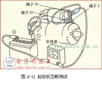 首先將起動機固定好,再按圖4-31所示連接導線,起動機運轉應平穩,同時驅動齒輪應移出。讀取安培表的數值,應符合標準值。斷開端子50后,起動機應立即停止轉動,同時驅動齒輪縮回。