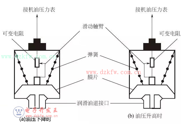 其工作原理如下圖所示,機油壓力傳感器內部有一個可變電阻,一端輸出信號,一端與搭鐵的滑動臂相連。當油壓增大時,油壓通過潤滑油道接口推動膜片彎曲,膜片推動滑動臂移動到低電阻位置,使電路中的輸出電流增大;反之,膜片推動滑動臂移動到高電阻位置,使電路中輸出電流減小,最終在機油壓力表上將機油壓力的大小以指針指示出來。