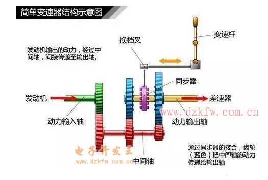手動變速器的工作原理,就是通過撥動變速桿,切換中間軸上的主動齒輪,通過大小不同的齒輪組合與動力輸出軸結合,從而改變驅動輪的轉矩和轉速。下面先看一下簡化的手動變速器(2檔)的構造圖。