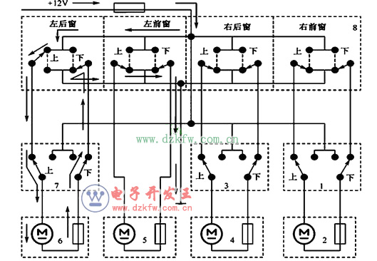 1-右前車窗開關 2-右前車窗電動機 3-右后車窗開關 4-右后車窗電動機 5-左前車窗電動機 6-左后車窗電動機 7-左后車窗開關 8-駕駛員主控開關組件