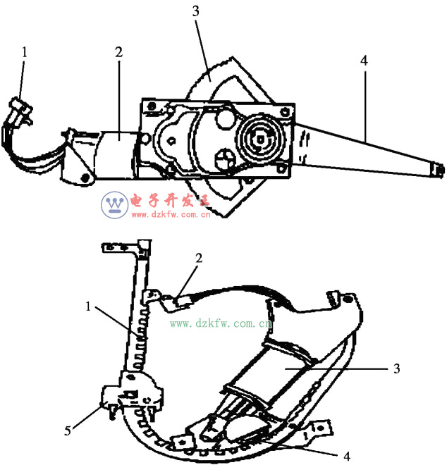 (2)齒扇式電動車窗升降器。用齒扇來實現換向作用如圖1-3所示。齒扇上有螺旋彈簧,當車窗上升時,彈簧展開,放出能量,以減輕電動機負荷當車窗下降時,彈簧壓縮,吸收能量,從而使車窗無論上升還是下降,電動機的負荷基本相同。