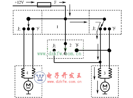 (1)駕駛員主控開關控制右前車窗上升。電流方向如圖所示箭頭所指。
