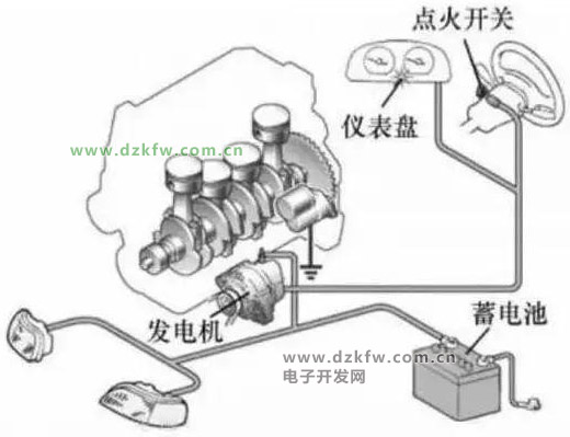 電源系統由蓄電池、發電機、調節器及工作狀況指示裝置【電流表、充電指示燈】等組成。其作用是向全車用電設備提供低壓直流電能。