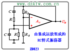 目前廣泛采用集成運(yùn)算放大器代替圖Z0820中的兩級(jí)放大電路來構(gòu)成RC橋式振蕩器。圖Z0823是它的基本電路。