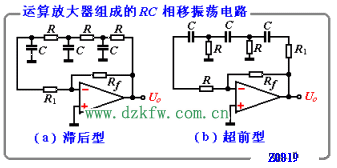 圖 Z0819為由運(yùn)算放大器組成的RC相移振蕩電路,三節(jié)RC網(wǎng)絡(luò)在特定頻率f0下產(chǎn)生180°相移,只要反相放大器增益適當(dāng),即可滿足振蕩條件而產(chǎn)生振蕩,放大器的放大倍數(shù)應(yīng)當(dāng)可調(diào),使之既能起振,失真又較小。超前型的運(yùn)算放大器組成的RC相移振蕩電路的振蕩頻率同于式GS0819。
