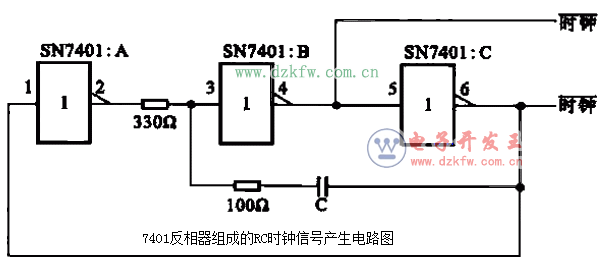 上圖所示為RC時鐘信號產生電路,它適用于大多數TTL系統。該電路只需要一塊6反相器集成電路SN7401中的3個反相器。時鐘頻率取決于RC的值,其中C的電容量:C為200 pF時,頻率為5 MHz;C為1 600 pF時,頻率為1 MHz。