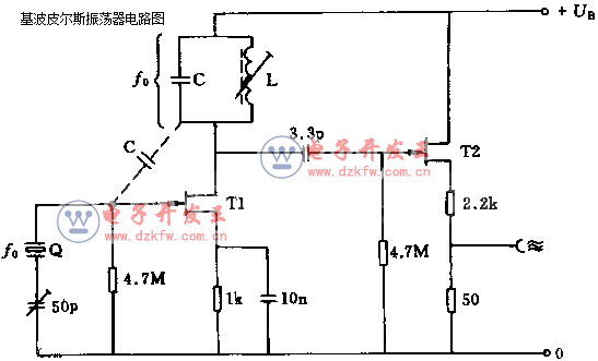 該振蕩器采用基波石英晶體,其振蕩頻率可達10MHz。振蕩回路調諧到諧振頻率。電容C要求在4.7pF以下。后接源跟隨器以與石英晶體回路隔離。基波皮爾斯振蕩器電路圖,LC振蕩電路mos管放大電路