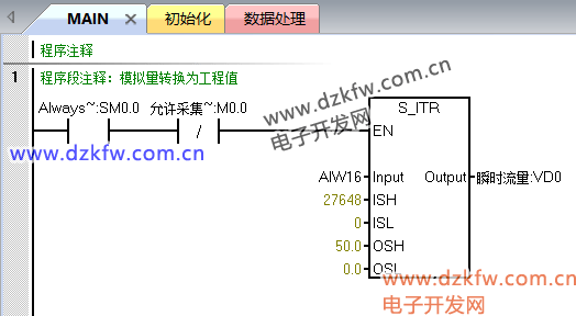 1.使用一個西門子200SMART模擬量輸入模塊采集流量瞬時值,通過模擬量轉換指令S_ITR轉換為工程量;