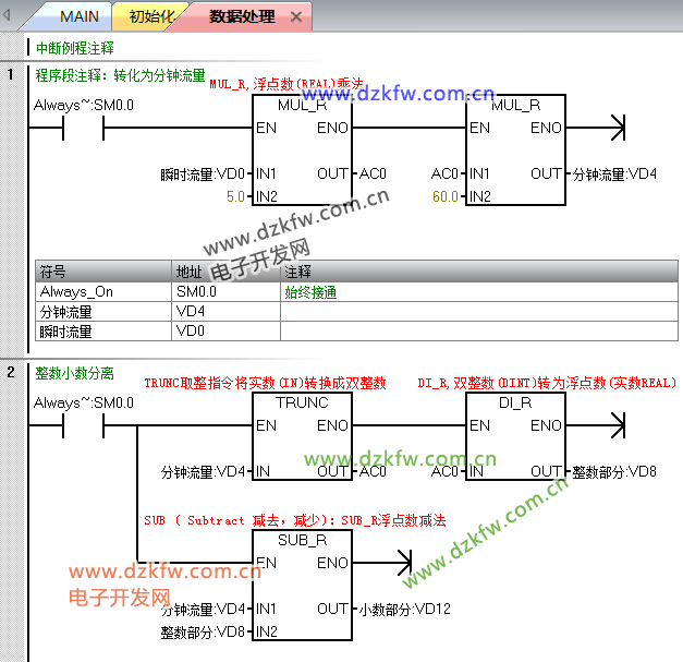 1.因有的十進制小數(shù)轉化為二進制存儲時會無限循環(huán),而200SMART只能存儲23位單精度浮點數(shù)的小數(shù)位,當前一個累積值比較大,而現(xiàn)時流量瞬時值較小時,兩者相加會因舍棄小數(shù)值造成誤差,累積次數(shù)越多,誤差越大。為減小誤差,可采用將采集的瞬時值分解成整數(shù)和小數(shù)兩部分,整數(shù)部分相加,小數(shù)部分相加,兩者的和再相加即為累積值,這樣可極大的減小累積誤差。