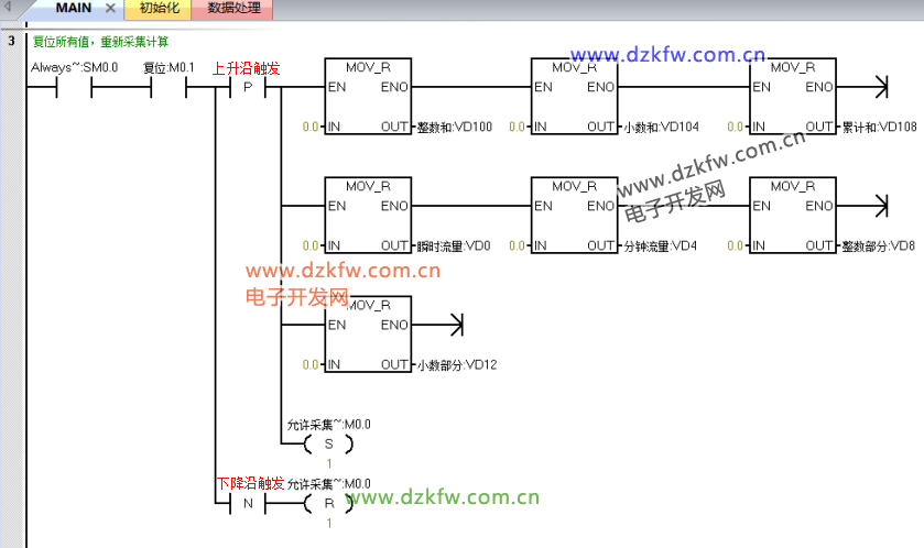 該梯形圖程序采用將浮點數(shù)分離為整數(shù)和小數(shù)兩部分,各自求和后再分別相加,得出當前流量累積值,大大減小了累積誤差,適用于要求精度不是很高的場合。