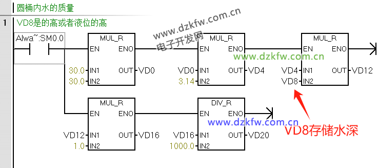 例:已知圓柱形水桶的半徑r=30cm,水深是用VD8存儲,求水的質量(kg)