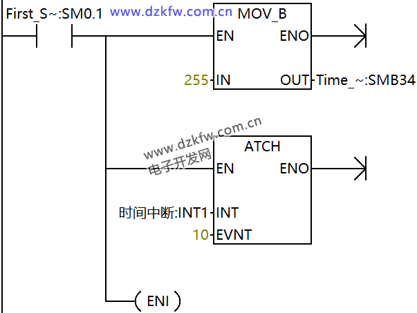 第一步:開中斷,中斷事件關聯為0,I0.0上升沿觸發中斷服務程序INT0