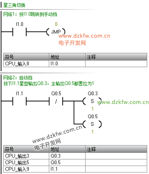 例如:電動(dòng)機(jī)的星/三角啟動(dòng)/停止控制系統(tǒng)。星Q0.3、角Q0.4、主Q0.5;按下I1.1通電,進(jìn)入自動(dòng)擋模式,6s后自動(dòng)星型轉(zhuǎn)三角形;按下I1.0切換至手動(dòng)模式,按下I1.1通電為星型啟動(dòng),按下I1.2后等待6s轉(zhuǎn)換成三角型;I1.3急停。