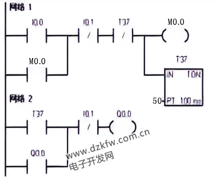 3. 延時啟?刂齐娐吩撾娐芬笥休斎胄盘柡,停一段時間輸出信號才為 ON;而輸入信號 0FF 后,輸出信號延時一段時間才 OFF。T37 延時 3 s 作為 Q0.0 的啟動條件,T38 延時 5 s 作為 Q0.0 的關斷條件。