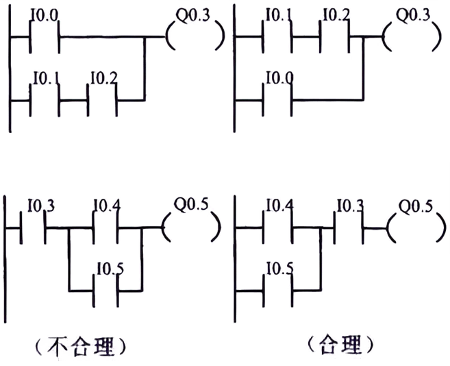 (3)幾個串聯支路相并聯,應將觸點多的支路安排在上面;幾個并聯回路的串聯,應將并聯支路數多的安排在左面。按此規則編制的梯形圖可減少用戶程序步數,縮短程序掃描時間。
