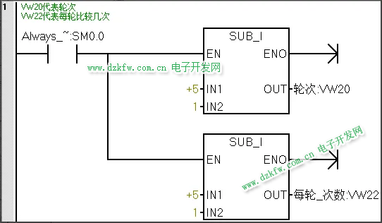 使用外循環FOR,循環次數存儲在VW24中,循環的輪次次數為4(VW20)
