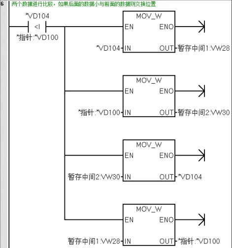 判斷*VD104(VW2)的數據與*VD100(VW0)的數據,當VW2的數據小與VW0的數據則交換位置。