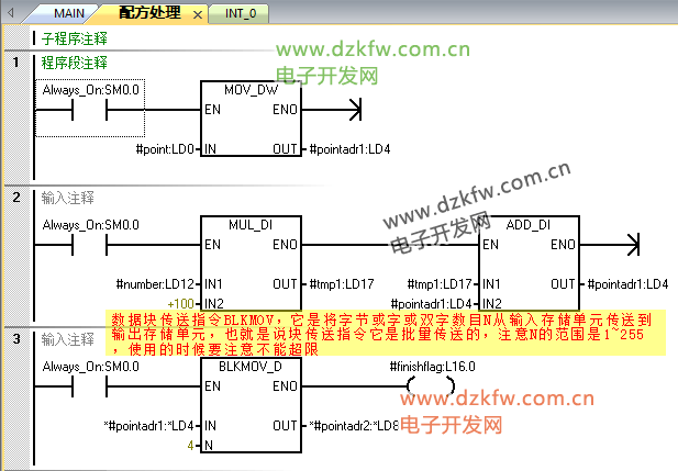 總結:巧妙地利用200SMART的間接尋址功能,可大大簡化程序的編寫工作量,即使配方數(shù)再多、配方數(shù)據(jù)再長,只要不超過PLC的存儲容量和掃描周期的長度,均可用這個案例程序來處理。另外配方子程序的最后那段采用批量傳送指令也很巧妙,不必使用FOR循環(huán)指令傳送,也簡化了程序編寫。