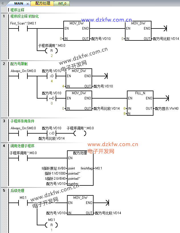 主程序編寫相對簡單,主要是在程序運行初期初始化一些變量、限定配方號數(shù)值、根據(jù)配方的選擇激活調(diào)用配方處理子程序的位變量M0.0以及子程序執(zhí)行完以后復位相關變量。如下圖4所示: