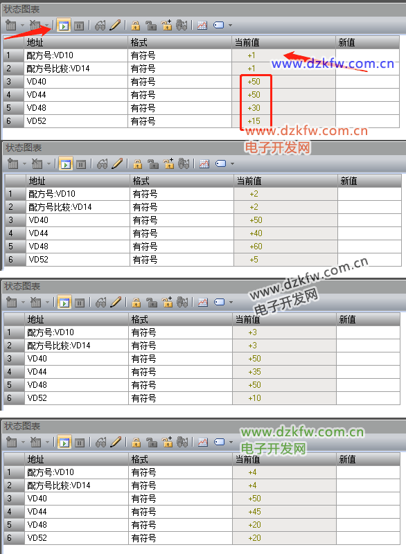 將程序下載到PLC中,選擇在線監(jiān)控,在狀態(tài)圖表中輸入需監(jiān)控的變量地址,將不同的配方編號寫入VD0中,大家和圖1的配方數(shù)據(jù)比較,可以發(fā)現(xiàn)數(shù)據(jù)是完全一致的。監(jiān)控視圖如下圖5所示: