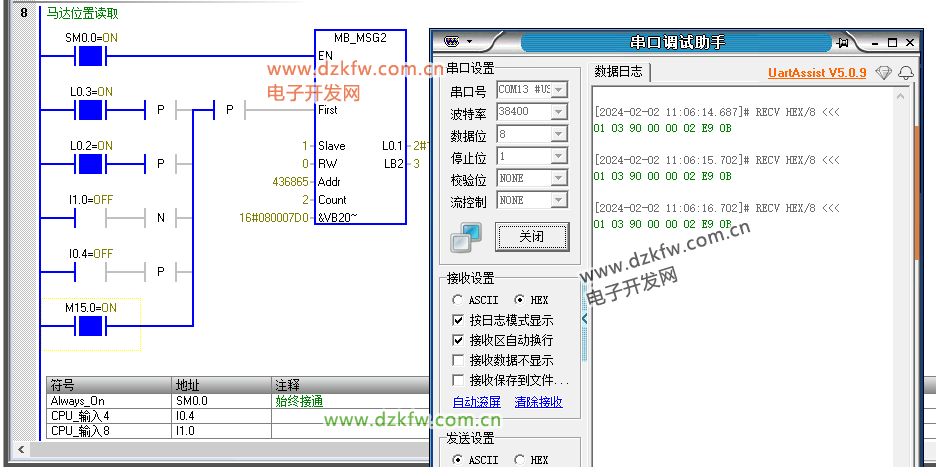 通過串口調(diào)試助手來測(cè)試一下:接通M15.0發(fā)送信號(hào),串口調(diào)試助手收到了PLC發(fā)送的信號(hào)。且可以看到收到的數(shù)據(jù)與IAI操作手冊(cè)示例一致。測(cè)試成功