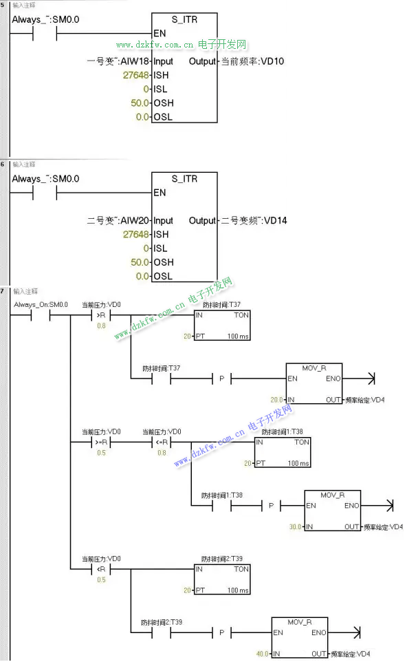 程序段 4 和 5 借助模擬量輸入庫文件,實現對當前壓力值以及變頻器頻率反饋值的讀取。通過這種方式,程序能夠實時獲取系統的關鍵運行參數,為后續的控制決策提供準確的數據支持。