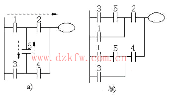 圖1a中可能有兩個方向的能流流過觸點5(經過觸點1、5、4或經過觸點3、5、2),這不符合能流只能從左向右流動的原則,因此應改為如圖1b所示的梯形圖。