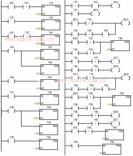 當(dāng)啟動(dòng)開關(guān)SD合上時(shí),I0.0觸點(diǎn)接通,Q0.2得電,南北紅燈亮;同時(shí)Q0.2的動(dòng)合觸點(diǎn)閉合,Q0.3線圈得電,東西綠燈亮。1秒后,T49的動(dòng)合觸點(diǎn)閉合,Q0.7線圈得電,模擬東西向行駛車的燈亮。維持到20秒,T43的動(dòng)合觸點(diǎn)接通,與該觸點(diǎn)串聯(lián)的T59動(dòng)合觸點(diǎn)每隔0.5秒導(dǎo)通0.5秒,從而使東西綠燈閃爍。又過3秒,T44的動(dòng)斷觸點(diǎn)斷開,Q0.3線圈失電,東西綠燈滅;此時(shí)T44的動(dòng)合觸點(diǎn)閉合、T47的動(dòng)斷觸點(diǎn)斷開,Q0.4線圈得電,東西黃燈亮,Q0.7線圈失電,模擬東西向行駛車的燈滅。再過2秒后,T42的動(dòng)斷觸點(diǎn)斷開,Q0.4線圈失電,東西黃燈滅;此時(shí)起動(dòng)累計(jì)時(shí)間達(dá)25秒,T37的動(dòng)斷觸點(diǎn)斷開,Q0.2線圈失電,南北紅燈滅,T37的動(dòng)合觸點(diǎn)閉合,Q0.5線圈得電,東西紅燈亮,Q0.5的動(dòng)合觸點(diǎn)閉合,Q0.0線圈得電,南北綠燈亮。1秒后,T50的動(dòng)合觸點(diǎn)閉合,Q0.6線圈得電,模擬南北向行駛車的燈亮。又經(jīng)過25秒,即起動(dòng)累計(jì)時(shí)間為50秒時(shí),T38動(dòng)合觸點(diǎn)閉合,與該觸點(diǎn)串聯(lián)的T59的觸點(diǎn)每隔0.5秒導(dǎo)通0.5秒,從而使南北綠燈閃爍;閃爍3秒,T39動(dòng)斷觸點(diǎn)斷開,Q0.0線圈失電,南北綠燈滅;此時(shí)T39的動(dòng)合觸點(diǎn)閉合、T48的動(dòng)斷觸點(diǎn)斷開,Q0.1線圈得電,南北黃燈亮,Q0.6線圈失電,模擬南北向行駛車的燈滅。維持2秒后,T40動(dòng)斷觸點(diǎn)斷開,Q0.1線圈失電,南北黃燈滅。這時(shí)起動(dòng)累計(jì)時(shí)間達(dá)5秒鐘,T41的動(dòng)斷觸點(diǎn)斷開,T37復(fù)位,Q0.3線圈失電,即維持了30秒的東西紅燈滅。