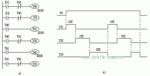 如圖3a所示為用三個定時器產生一組順序脈沖的梯形圖程序,順序脈沖波形如圖3b所示。當X4接通,T40開始延時,同時Y31通電,定時l0s時間到,T40常閉觸點斷開,Y31斷電。T40常開觸點閉合,T41開始延時,同時Y32通電,當T41定時15s時間到,Y32斷電。T41常開觸點閉合,T42開始延時.(www.tsxfzk.com 版權所有)同時Y33通電,T42定時20s時間到,Y33斷電。如果X4仍接通,重新開始產生順序脈沖,直至X4斷開。當X4斷開時,所有的定時器全部斷電,定時器觸點復位,輸出Y31、Y32及Y33全部斷電。