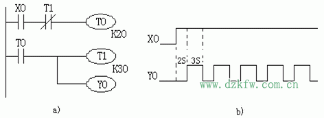 如圖2所示為采用兩個定時器產生連續脈沖信號,脈沖周期為5秒,占空比為3:2(接通時間:斷開時間)。接通時間3s,由定時器T1設定,斷開時間為2s,由定時器T0設定,用Y0作為連續脈沖輸出端。