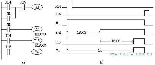 如圖5所示為定時時間為1h的梯形圖及時序圖,輔助繼電器M1用于定時啟停控制,采用兩個0.1s定時器T14和T15串級使用。當T14開始定時后,經1800s延時,T14的常開觸點閉合,使T15再開始定時,又經1800s的延時,T15的常開觸點閉合,Y4線圈接通。從X14接通,到Y4輸出,其延時時間為1800s+1800s=3600s=1h。