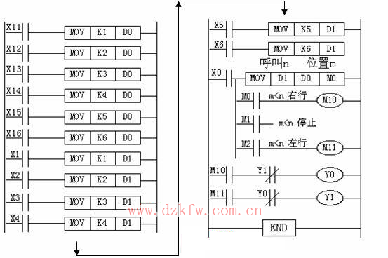 圖中將送料車當前位置送到數據寄存器 D0 中,將呼叫工作臺號送到數據寄存器 D1 中,然后通過 D0 與 D1 中數據的比較,決定送料車的運行方向和到達的目標位置。