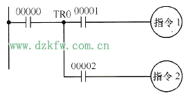 TR區(qū)域提供8個(gè)位(TR0~TR7),可用來(lái)暫存分支點(diǎn)的執(zhí)行條件。方法是將TR位放置在分支點(diǎn)處,則當(dāng)前分支點(diǎn)處的執(zhí)行條件就會(huì)存儲(chǔ)在TR位中,當(dāng)程序返回到分支點(diǎn)時(shí),可以取出TR位保存的執(zhí)行條件,去執(zhí)行其他分支行。圖所示是一個(gè)具有兩個(gè)分支的梯形圖,該圖中在分支點(diǎn)就使用了TR0位。