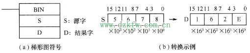 BCD到BIN轉(zhuǎn)換指令是將源字中的4位BCD碼轉(zhuǎn)換成16位二進(jìn)制數(shù),并輸出到結(jié)果字中。其梯形圖符號(hào)和轉(zhuǎn)換示例如圖所示。