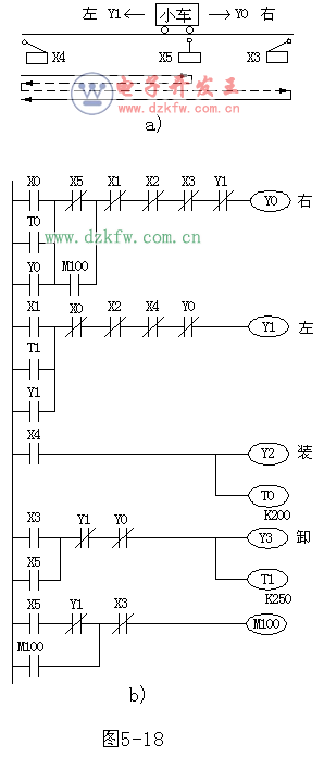 兩處卸料小車運行路線示意圖如圖6-18a所示,小車仍然在限位開關X4處裝料,但在X5和X3兩處輪流卸料。小車在一個工作循環(huán)中有兩次右行都要碰到X5,第一次碰到它時停下卸料,第二次碰到它時繼續(xù)前進,因此應設置一個具有記憶功能的編程元件,區(qū)分是第一次還是第二次碰到X5。