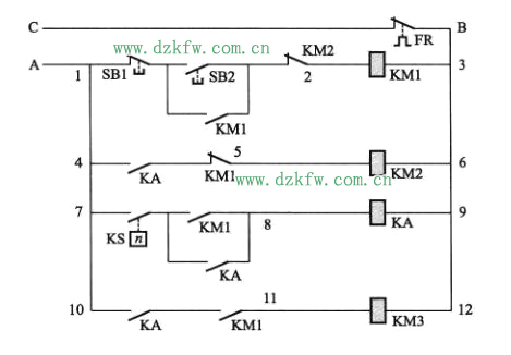 當電動機快速降速至速度繼電器KS的額定轉速時將斷開,電動機停轉。本控制線路中,共有四個回路: