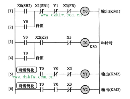 梯形圖每一行從左母線開始并終止于右母線,觸頭不能與右母線直接相連,線圈不能與左母線直接相連。www.tsxfzk.com版權所有!圖5中第1, 3, 4, 6支路中的常閉觸頭X3直接接在了右母線上,因與各自的線圈互換位置,才能符合“觸頭不接右母線”的規則。
