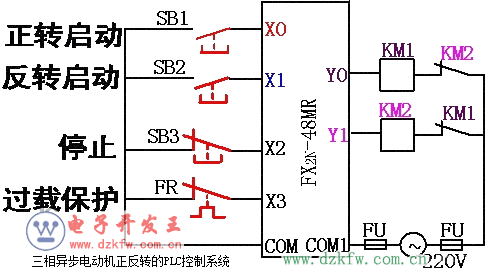 注意:雖然在梯形圖中已經(jīng)有了軟繼電器的互鎖觸點(diǎn),但在外部硬件輸出電路中還必須使用KM1、KM2的常閉觸點(diǎn)進(jìn)行互鎖。因?yàn)镻LC內(nèi)部軟繼電器互鎖只相差一個(gè)掃描周期,而外部硬件接觸器觸點(diǎn)的斷開時(shí)間往往大于一個(gè)掃描周期,來不及響應(yīng)。例如Y0雖然失電,可能KM1的主觸點(diǎn)還未斷開,在沒有外部硬件互鎖的情況下,KM2的主觸點(diǎn)可能已接通,引起主電路短路。因此必須采用軟硬件雙重互鎖。