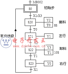 S0 : PLC 上電之初由初始化脈沖 M8002 (只閉合一個(gè)掃描周期)對(duì)其置位為 ON ,為以后活動(dòng)步的轉(zhuǎn)移作準(zhǔn)備,在工作過(guò)程中,由右限位對(duì)其置位為 ON 。
