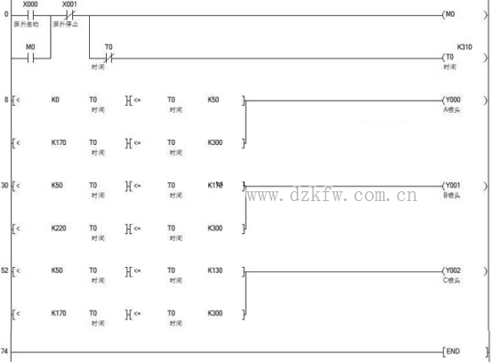 利用ZCP指令編寫程序,ZCP指令的源操作數(shù)[S·]均為K、H、KnX、KnY、KnM、KnS、T、C、D、V、Z,其目標(biāo)操作數(shù)[D·]均為Y、M、S。該指令是將一個(gè)源操作數(shù)[S·]的數(shù)值與另兩個(gè)源操作數(shù)[S1·]和[S2·]的數(shù)據(jù)進(jìn)行比較,結(jié)果送到目標(biāo)操作元件[D·]中,源數(shù)據(jù)[S1·]不能大于[S2·]。