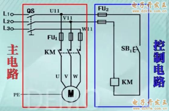 這個是一個傳統的控制電路,我們這個電路它分為:主電路和控制電路兩部分。 1、主電路有:QS(斷路器)、FU(熔斷器)、KM(接觸器主觸點)M(電動機)所組成。2、控制電路(也稱為輔助電路):由FU(熔斷器)、SB(常開觸點)、KM(接觸器線圈)構成。大家:再看下面這個圖,如圖3: