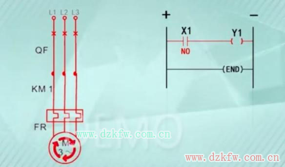常開按鈕SB1接到PLC的輸入點X1,當我們把SB1按鈕按下輸入回路就接通了,X1就得到一個IO信號,X1的IO信號送到PLC內部進行運算,就輸出一個信號,輸出的信號Y1將輸出回路接通,KM1線圈得電,對應的主電路中的KM主觸點就吸合了,我們再看下面這個圖,如圖6: