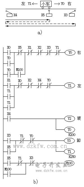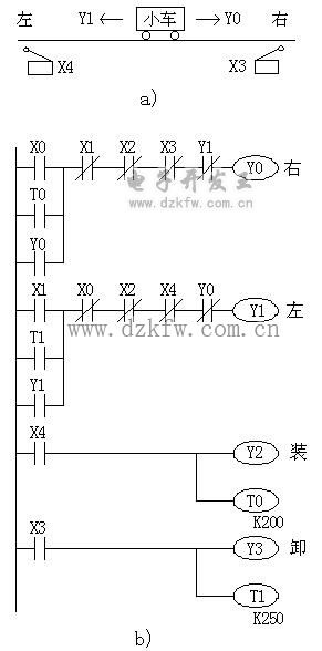 (2)程序設計思路 以眾所周知的電動機正反轉控制的梯形圖為基礎,設計出的小車控制梯形圖如圖1b所示。為使小車自動停止,將X3和X4的常閉觸點分別與Y0和Y1的線圈串聯。為使小車自動起動,將控制裝、卸料延時的定時器T0和T1的常開觸點,分別與手動起動右行和左行的X0、X1的常開觸點并聯,并用兩個限位開關對應的X4和X3的常開觸點分別接通裝料、卸料電磁閥和相應的定時器。