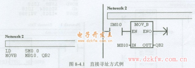 [例8-5]利用直接尋址的方式,將標志存儲器MB10的內容一次性在QB2上輸出的程序如圖8-4.1所示。