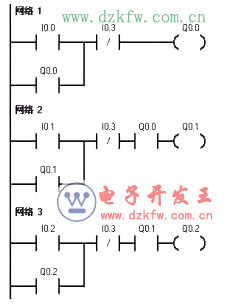 單向順序啟動控制電路是按照生產工藝預先規定的順序,在各個輸入信號的作用下,生產過程中的各個執行機構自動有序動作。只有Q0.0啟動后,Q0.1方可啟動,Q0.2必須在Q0.1啟動完成后才可以啟動。