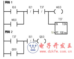3.延時啟停控制電路該電路要求有輸入信號后,停一段時間輸出信號才為ON;而輸入信號0FF后,輸出信號延時一段時間才OFF。T37延時3 s作為Q0.0的啟動條件,T38延時5 s作為Q0.0的關斷條件。